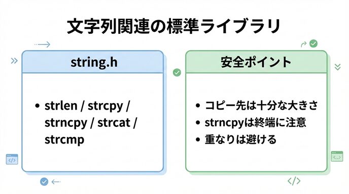 | 連結 | strcat / strncat | 末尾に追加(n制限あり/なし) |