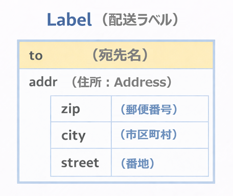 「住所(Address)」を構造体で表し、それを「配送ラベル(Label)」のメンバとして持たせます。