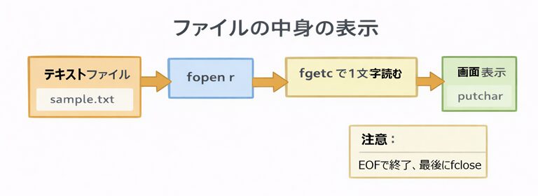 - ファイル入力の基本セットは fopen → fgetc → putchar → fclose です。