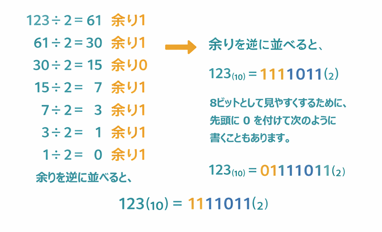 10進数を2進数に変換するときは、2で割って余りを逆順に並べる方法を使います。