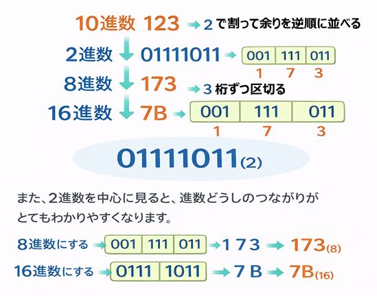 ここからは、10進数の 123 を例にして、2進数、8進数、16進数のつながりを見ていきます。