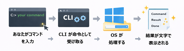 この図は、CLI を 操作画面 ではなく 指示の通り道 としてイメージしやすくするための図です。