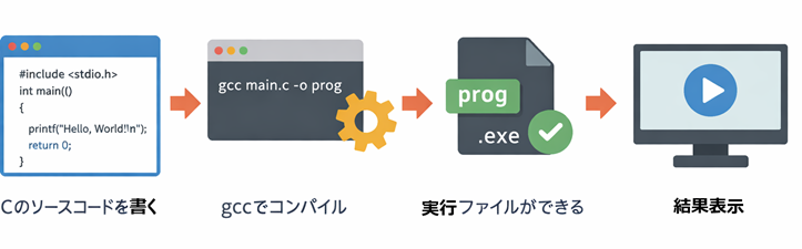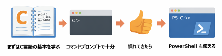 - C言語学習では、まずコマンドプロンプトで基本操作を覚えると進めやすい。