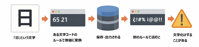この図は、文字化けが起きる流れをシンプルに見せています。