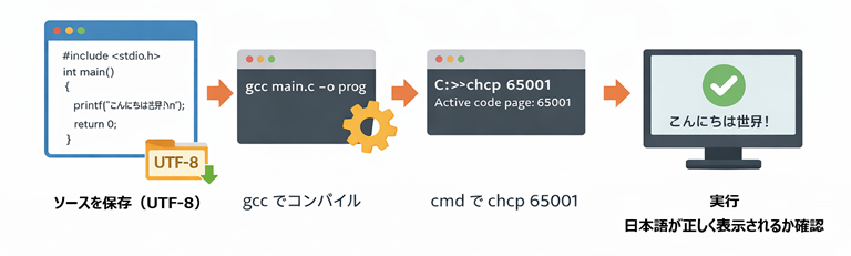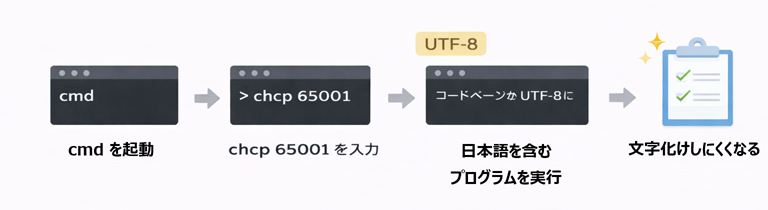 - chcp 65001 で cmd 側を UTF-8 に合わせると、日本語表示が安定しやすい。