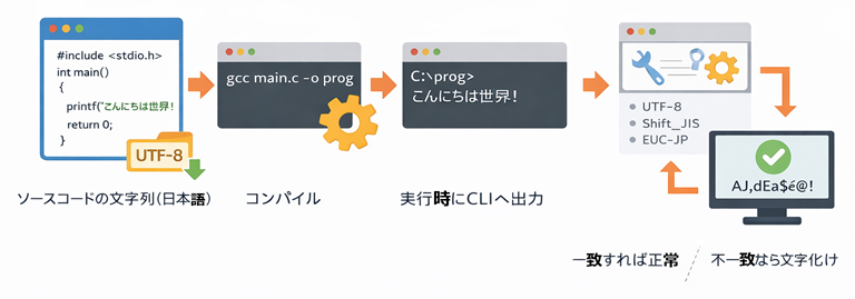 C言語のプログラムそのものは正しくても、表示側のルールが違うと文字化けします。