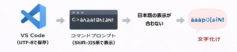 VS Code 側とコマンドプロンプト側の文字コードがズレると、ソースコードは正しくても表示が崩れます。
