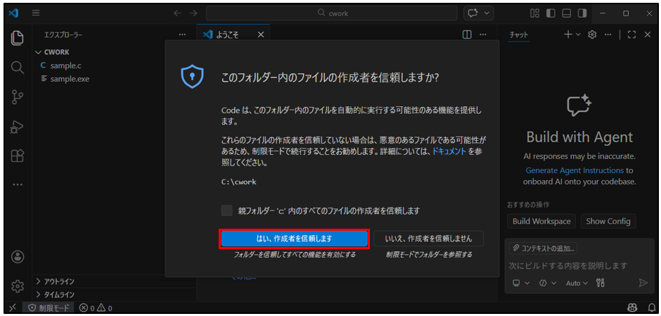 - 信頼確認が表示されたら はい、作成者を信頼します を選択