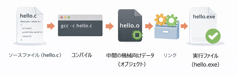 C言語は、いきなりプログラムが動くわけではなく、ソースファイルを作る → コンパイルする → リンクする → 実行する、という順番で進みます。