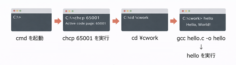 C:\cwork>最初は「何も出ないけど大丈夫?」と感じやすいのですが、何も出ない = 成功 というケースはよくあります。