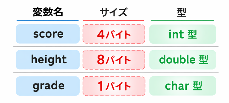 ここで大事なのは、変数名が違うだけでなく、型が違うと必要なメモリサイズも違うということです。
