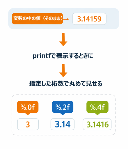 つまり、%.2f で表示したからといって、変数の中身そのものが 2桁になるわけではありません。