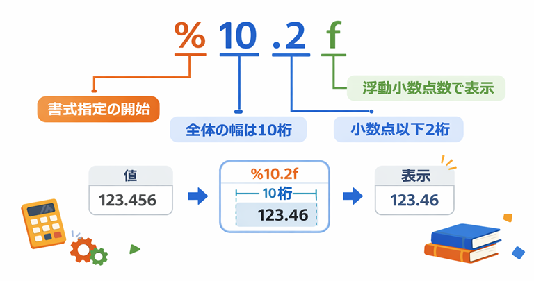 まずは %5d、%-5d、%05d、%.2f、%8.2f あたりを何度か試してみると、感覚がつかみやすくなります。