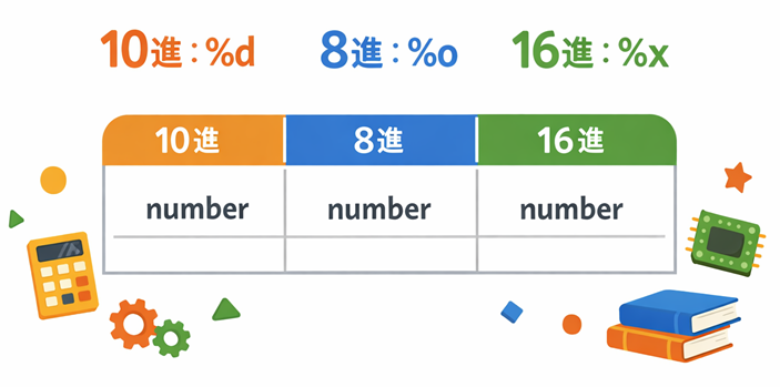 最初は %d、%o、%x だけでも十分ですが、ここが理解できると、後で %f や %c や %s もスムーズに覚えられます。