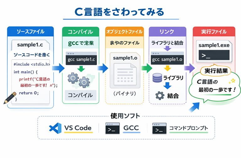このページでは、C言語の最初の体験として、プログラム作成の基本の流れ(記述 → コンパイル → リンク → 実行)を、表と具体例でしっかり整理していきます。