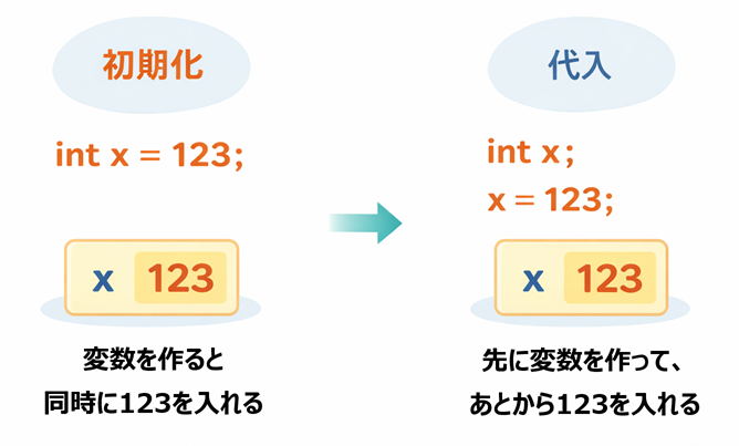 このパートでは、初期化と代入の違いをしっかり整理しながら、