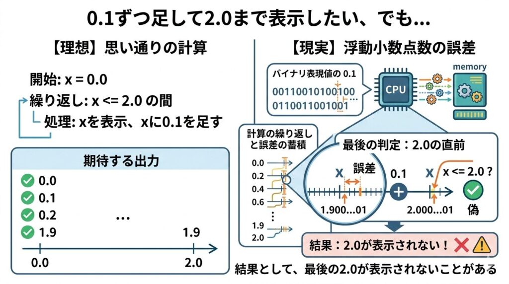 例:0.1から2.0までを確実に表示する(誤差回避)