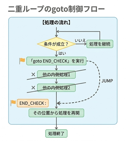 多重ループの中で条件が成立したとき、ループの外にあるラベルへ一気に飛ぶことで、内側も外側もまとめて抜けることができます。