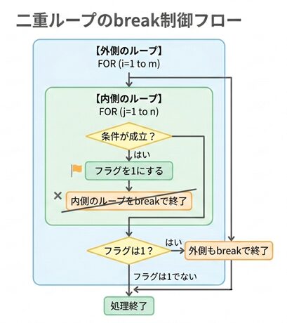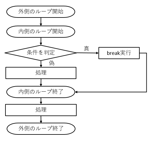 多重ループの break文 の動きを、流れで表すと次のようになります。