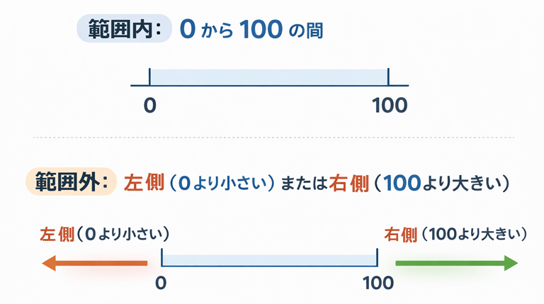 範囲外は「範囲内でない」です。つまり