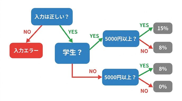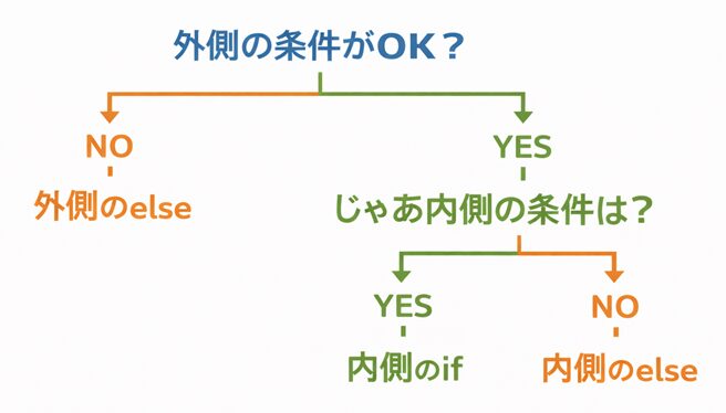 ネスト構造は、ざっくり言うと 「大きい条件の中に、もう一段細かい条件を入れる」 という考え方です。