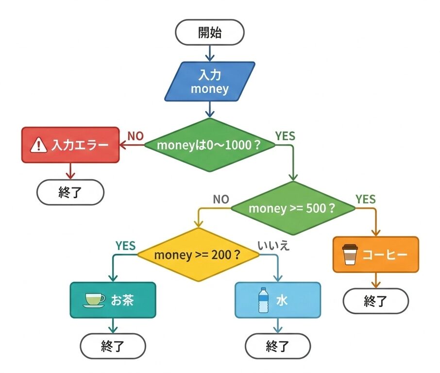 「所持金が正しい範囲か確認 → その上で“買える飲み物”を判定」するプログラム例です。