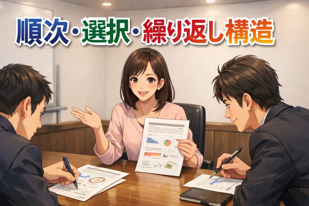 プログラムはこの3つでできている!「順次・選択・繰り返し」を押さえると、アルゴリズムが一気に組めるよ。