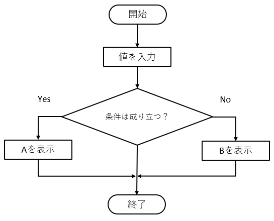 流れ図では判断(ひし形)で Yes / No に分岐する形になります。