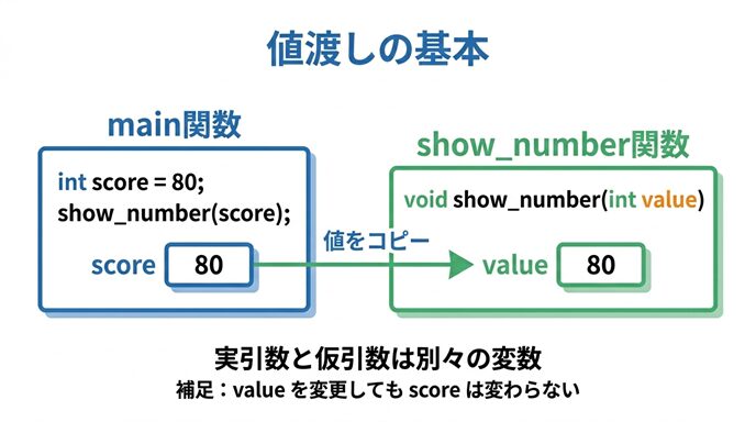 | 関数定義 | void show_number(int value) | value で受け取って使う |