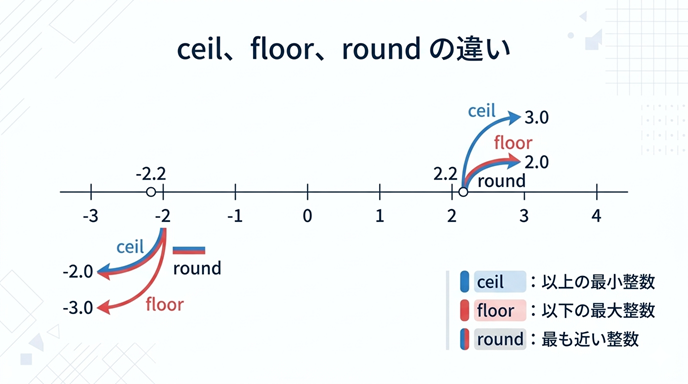この図では、2.2 と -2.2 に対して、ceil、floor、round がそれぞれどこへ丸めるのかを数直線で示しています。