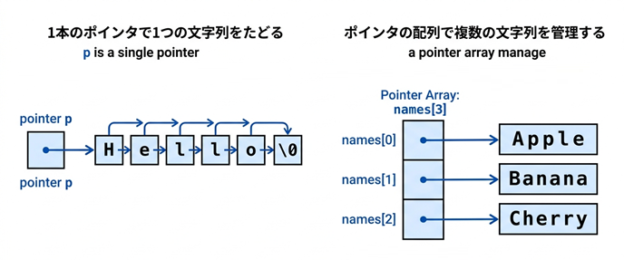 この図では、1本のポインタが文字列の先頭を指し、\0 まで1文字ずつ進んでいく流れと、ポインタの配列が複数の文字列の先頭をまとめて管理している流れをあわせて示します。