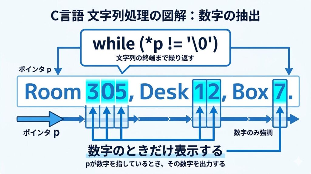 この図を見ると、ポインタが1文字ずつ順番に文字列を調べていることがはっきりわかります。