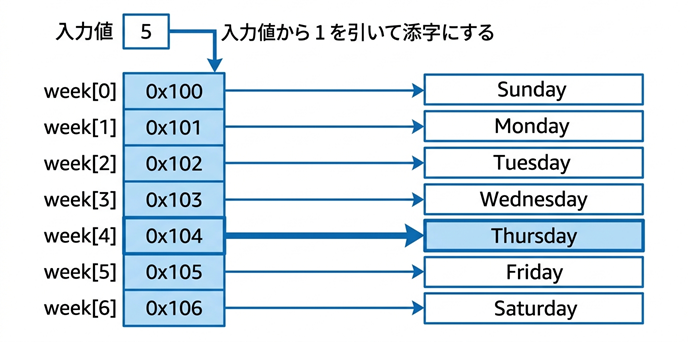 入力値 5 が与えられたときに、week[4] を参照して Thursday を表示する流れがわかるようにすると理解しやすいです。