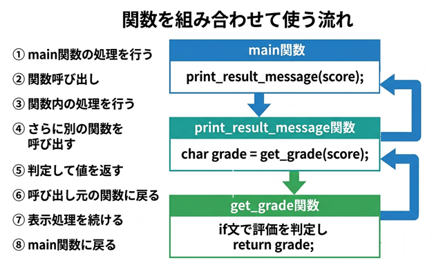 関数を組み合わせて使うとは、ある関数の中で別の関数を呼び出し、その結果を利用してさらに処理を進めることです。