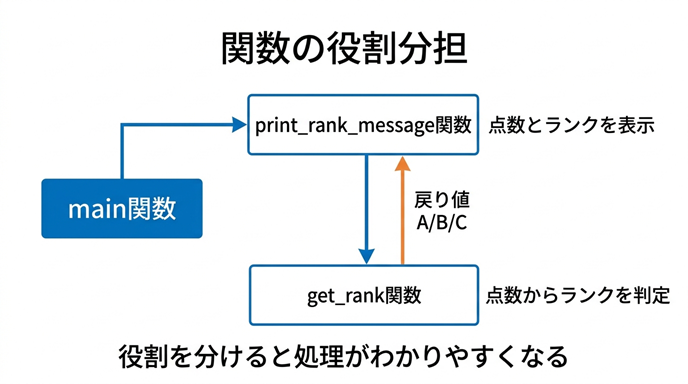 という分担が見えるので、関数を分ける意味が直感的に理解しやすくなります。