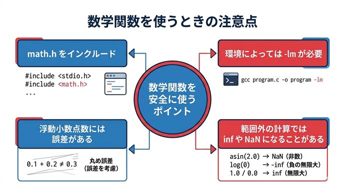 関数そのものの使い方だけでなく、ヘッダファイル、リンク指定、浮動小数点誤差、範囲外の値といった点も理解しておくと、トラブルを減らしやすくなります。