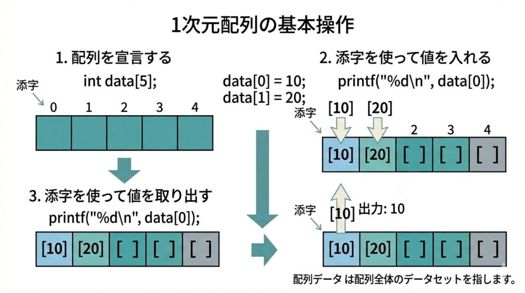 この基本がしっかり分かると、次に学ぶ繰り返し処理との組み合わせ、配列の初期化、2次元配列、文字列、関数への受け渡しなども理解しやすくなります。