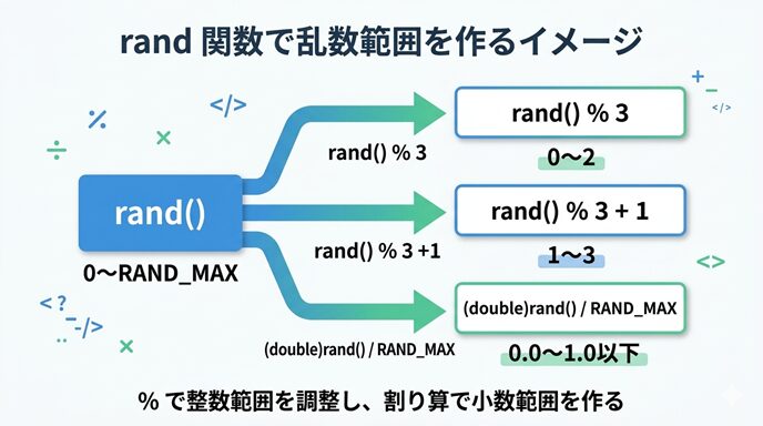 この図では、rand() が返す大きな範囲の整数値から、% 演算子や割り算を使って必要な範囲の値を作る流れを表しています。