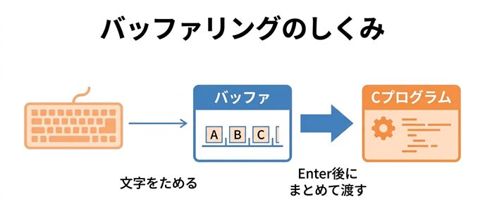 このため、getchar は1文字ずつ取り出していても、入力そのものはバッファを通してまとめて渡されることがあります。