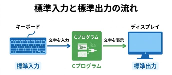 この図では、キーボードから入力された文字が標準入力を通ってCプログラムに入り、その結果が標準出力を通ってディスプレイへ表示される流れを表しています。