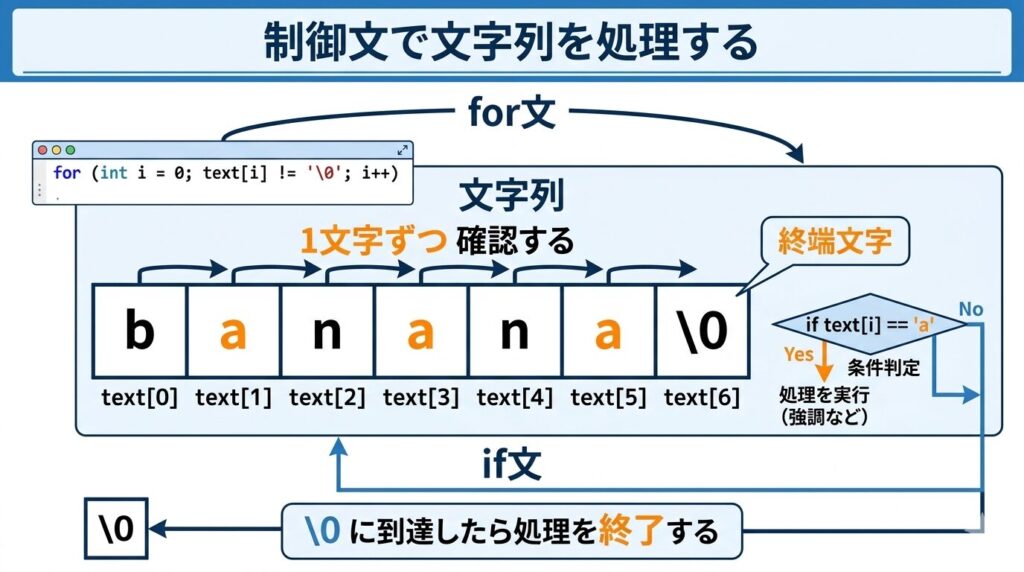 特にC言語では、文字列の終わりを表すナル文字 \0 があるため、ループでは「どこまで処理するか」を \0 で判断する場面がたくさん出てきます。