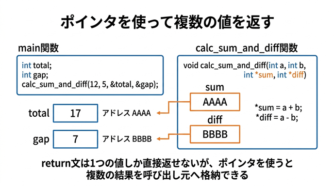 calc_sum_and_diff(12, 5, &total, &gap);ここで渡しているのは、変数そのものではなく、