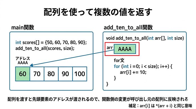 ポインタを使うと、関数の外にある変数や配列に直接アクセスできるようになります。