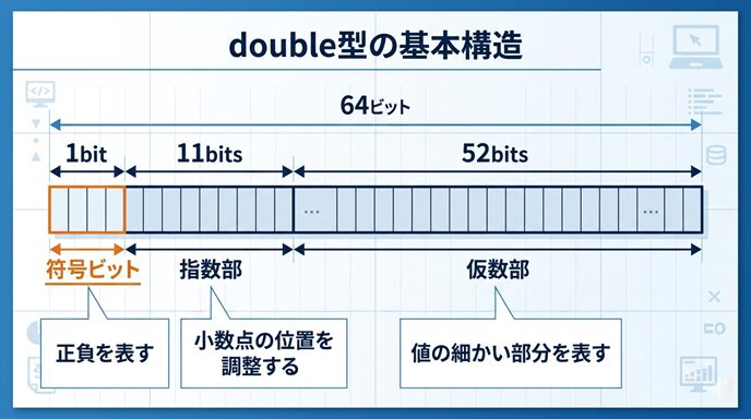 double 型は 64ビットで表されることが多く、基本的な構造は次のようになります。
