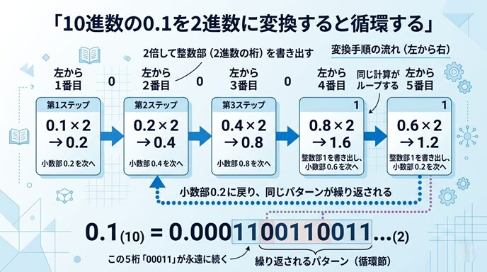 0.1 を 2進小数にすると、次のように循環していきます。