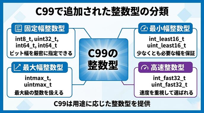 ここでは、C99で追加された整数型の種類と役割を整理しながら、移植性を高める整数型の選び方をじっくり見ていきましょう。