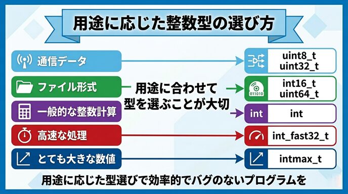 特に大事なのは、すべての場面で固定幅整数型を使うのではなく、目的に合わせて使い分けることです。