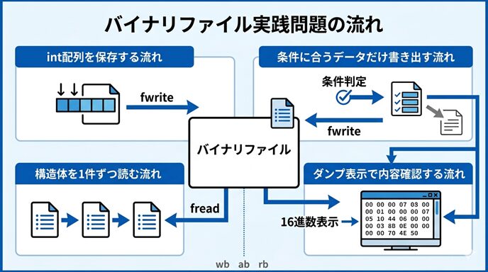 バイナリファイルでは、構造体や数値配列をそのまま fwrite し、fread で読み戻しやすいのが特徴です。元の実践問題群も、その性質を活かした構成でした。