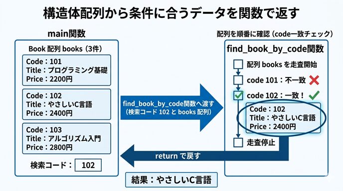 この図では、main 関数から配列全体そのものを丸ごと移動させているわけではなく、配列の先頭を基準に関数が順番に要素を調べている、という見方が大切です。そして、条件に一致した1件が戻り値として返される流れになっています。
