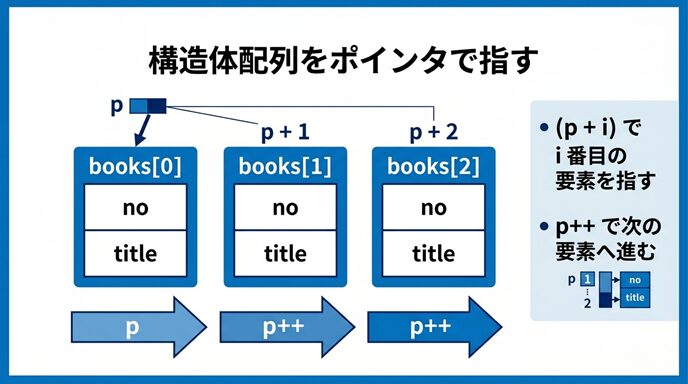ここでは、構造体配列をポインタで指す基本、ポインタ演算によるアクセス、ポインタ自体を進める方法まで、順番にやさしく見ていきましょう。